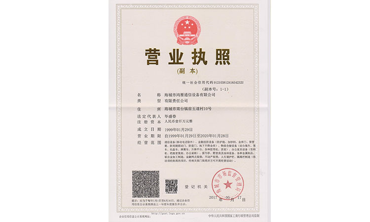 海城市鴻雁通信設(shè)備有限公司成立于1985年,位于海城市鞍海公路東側(cè),交通便利。注冊資金1000萬,占地面積17800平方米,職工120人,年產(chǎn)值600多萬。法人代表畢盛春,曾多次獲得“中國誠信企業(yè)家”稱號。